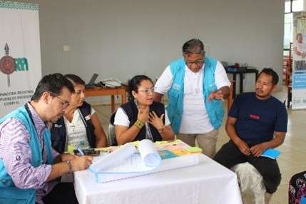 Representantes de instituciones públicas, organizaciones y comunidades indígenas participan en las mesas de diálogo para fortalecer la gestión del riesgo de desastres en la Amazonía. © MATTEO ZULIAN